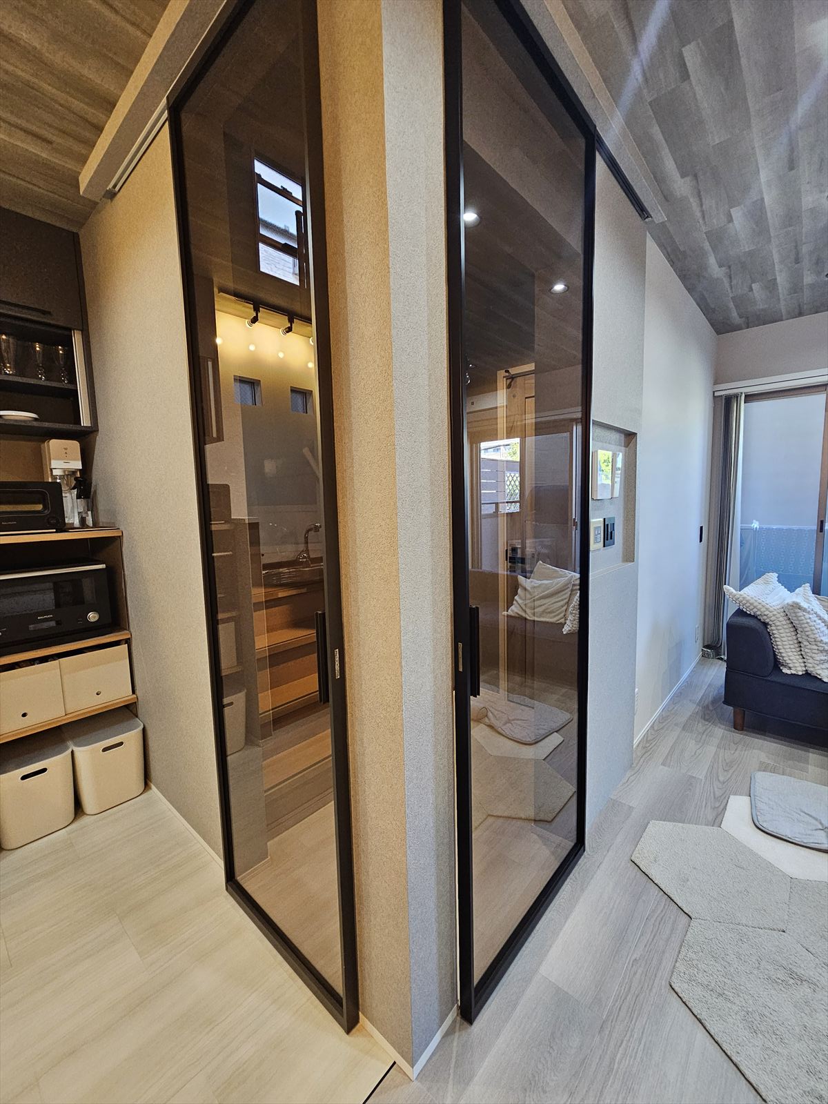 LDKはフロアタイルで雰囲気を一掃し、ガラスの建具を新調。クロスも全面張替て